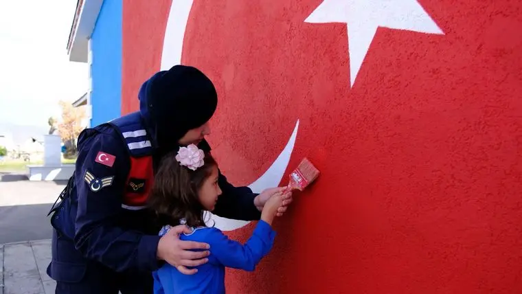 Merkeze bağlı Uğrak köyündeki ilkokulda yapılan etkinlikte, okulun bir duvarına jandarma ekipleri ve öğrenciler işbirliğiyle dev bir Türk Bayrağı çizilerek Cumhuriyet coşkusu yaşatıldı.